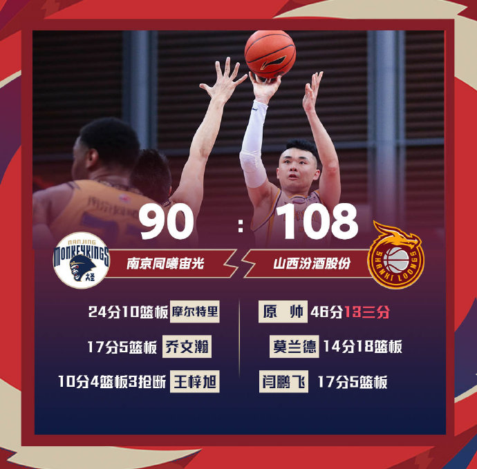 山西(17-25):原帅46分3篮板3助攻,莫兰德14分18篮板3助攻3封盖,葛昭宝10分8篮板3助攻,闫鹏飞17分5篮板,周湛东9分4助攻,刘冠岑8分4篮板。