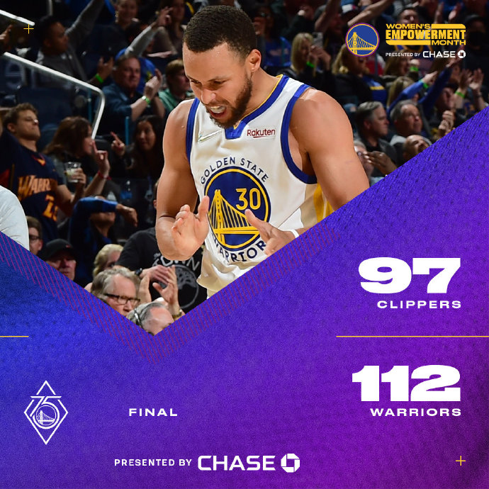 优直播3月9日讯 勇士今日坐镇主场迎来快船的挑战,勇士上一场大面积轮休后不敌掘金遭遇5连败,目前排名也下降至西部第三,快船则在上一场不敌尼克斯结束5连胜。首节之争勇士前半节表现非常糟糕,前4分钟里仅得4分导致开局被动,不过快船虽然以一波7-2的攻势占据上风,奈何随后也跟着对手节奏不断打铁,勇士在喘息过后及时回暖追上比分,次节勇士开始接管比赛,多点开花的他们先是一波8-0,随后又是一波14-0,这两波进攻帮助勇士取得18分优势进入下半场。第三节争夺勇士彻底接管比赛,以克莱和普尔为首,勇士这一节再胜7分并取得25分的领先,末节快船虽然回暖轰出一波22-8的攻势,但此时分差还有15分之多,而时间又所剩不多无力制造威胁。最终,勇士主场复仇快船,同时结束5连败。