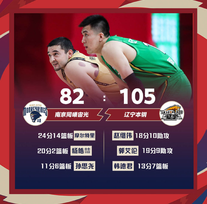 辽宁(37-8):韩德君13分7篮板、吴昌泽14分11篮板3助攻3抢断、赵继伟18分3篮板10助攻4抢断、张镇麟9分4篮板、郭艾伦19分2篮板9助攻3抢断、付豪16分5篮板2助攻、王化东3分、贺天举5分、鄢手骐5分2抢断、丛明晨3分