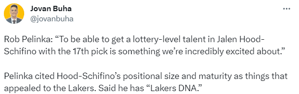 胡德-希菲诺的尺寸和成熟度是湖人选他的原因,佩总还表示胡德-希菲诺身上有湖人DNA,盛赞胡德是一名可以打控球后卫和得分后卫的双能卫球员。