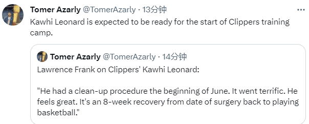 来源:优直播06-24 11:04优直播06月24日讯 ,在NBA选秀结束后,快船总裁劳伦斯-弗兰克辟谣,快船继续围绕小卡和乔治打造球队,透露小卡已经成功接受半月板清创手术,预计8周后康复;快船总裁还表示希望威少能够续约回归。