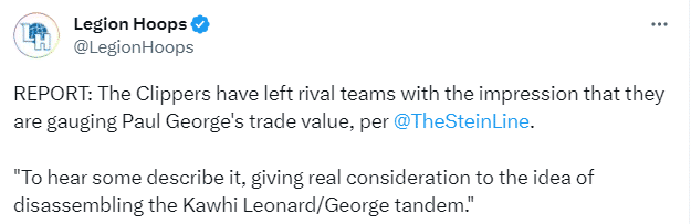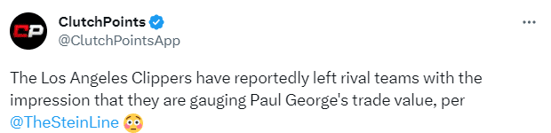 曝快船考虑交易乔治以及拆散乔卡组合,Marc Stein还表示,如果快船在2024-25赛季搬到老板史蒂夫-鲍尔默位于加利福尼亚州英格伍德的新球馆之前,他们真的想在这最后一个赛季大幅改组阵容,那么达米安-利拉德的手握3号签的开拓者和寻找球星的手握4号签的火箭已经被认定为潜在的交易伙伴。