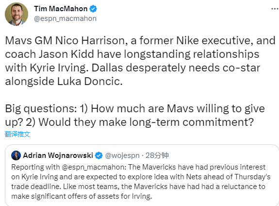 Tim MacMahon还表示,独行侠总经理尼克-哈里森与主帅基德与欧文有着长期的关系,且球队迫切需要为东契奇寻找一位搭档。目前摆在独行侠面前的只有两个问题:1、究竟愿意为得到欧文付出多少资产;2、是否向欧文做出长期承诺?(即是否与欧文续长约,此前欧文想从篮网得到最多4年2亿美元的顶薪合同)