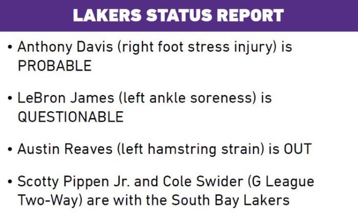 来源:优直播02-04 16:19优直播02月04日讯 ,湖人官方公布下一场对阵鹈鹕的伤病报告,浓眉(右脚应激反应)大概率出战,詹姆斯(左脚踝酸痛)出战成疑;里夫斯(左腿筋拉伤)、小皮蓬(发展联盟)和斯威德(发展联盟)继续缺席比赛。