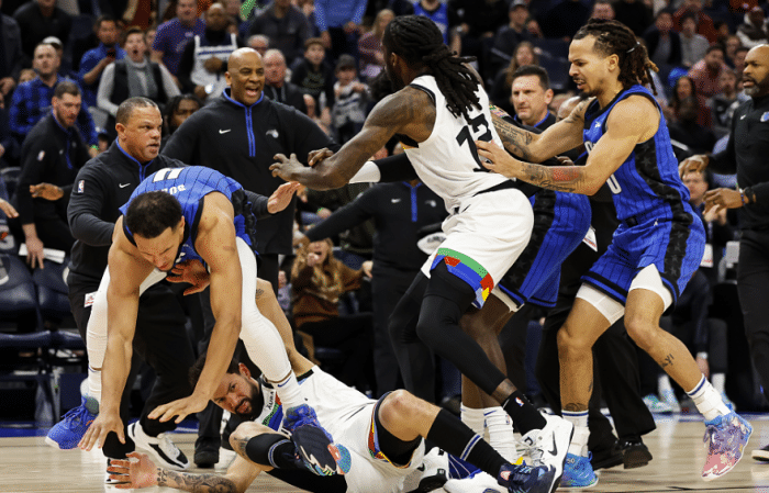 在魔术与森林狼的比赛第三节末段,场上突然爆发大规模冲突,班巴和小里弗斯互殴,多人参与乱战——小里弗斯投丢三分后,班巴坐在替补席嘲讽小里弗斯,之后班巴和小里弗斯在魔术替补席爆发冲突,两人挥拳抱摔互殴,萨格斯冲过来放倒小里弗斯,之后普林斯等人也加入混战,他们扭打在一起,现场十分混乱。