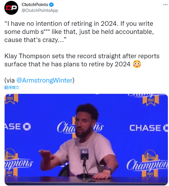 来源:优直播10-21 16:27优直播10月21日,勇士球星克莱-汤普森公开辟谣,爆粗直言:我无意在2024年退役,仅仅因为我没打5V5就这样写简直太荒谬了。