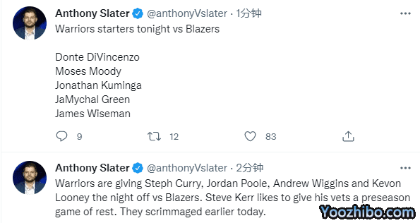 据勇士随队记者Anthony Slater报道,勇士让库里、普尔、维金斯和卢尼都休息一晚,轮休无缘对阵开拓者;科尔想让他们休息一下,因为早些时候他们都参加了队内训练赛。