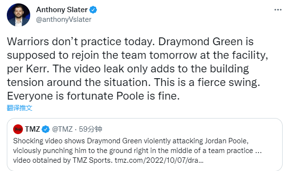 格林拳击普尔视频曝光后,勇士记者Anthony Slater发推写道:勇士今天没有训练。据科尔透露,追梦本来预计将在明天归队参加训练。视频的泄露只会加剧目前紧张的局面,这拳打得很重,庆幸的是普尔没事。