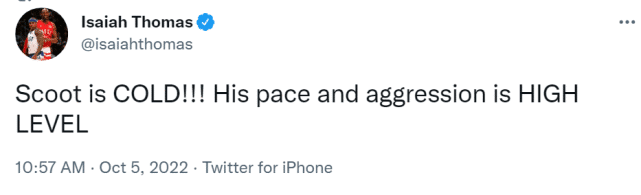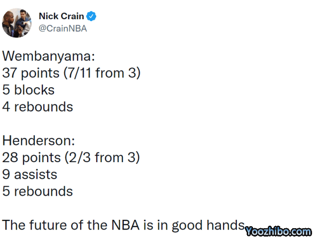 米切尔在社媒上感慨:“文班亚马和亨德森之间的对决太棒了!”小托马斯写道:“亨德森的速度和侵略性是高水准的!”巴图姆写道:“有一点是可以确定的,下一届NBA选秀的前两顺位已经锁定了!”有记者调侃文班亚马和亨德森的天赋,让不少NBA球队恨不得0胜82负了。
