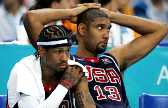 2004年,艾弗森和邓肯领衔的梦六队,当时詹姆斯,安东尼,韦德还是菜鸟,不能担起重任。在2004年雅典奥运会上,名帅拉里布朗带领球队征战,但最终只拿到铜牌,取得第三名,而金牌获得者是阿根廷,银牌获得者是意大利。梦之队连续在国际大赛中输球,这也是为何在2008年,老K教练直言,“我们最好的球员(科比)来了”。