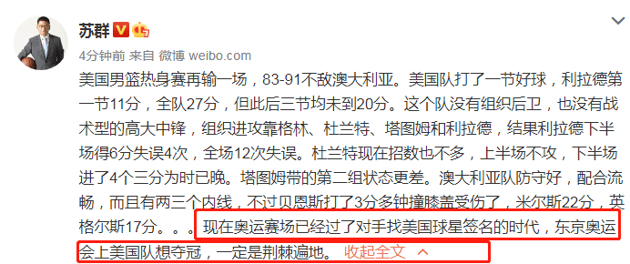 在美国男篮输给澳大利亚男篮之后,苏群老师的一番话一针见血,能反映出很多问题,在国际大赛上,对手不会再去找KD和利拉德等球星要签名了,梦之队想要造奥运赛场夺金,必定荆棘遍地。以往,对手会向乔丹要签名,会向科比要签名,会向詹姆斯要签名,现在问谁要?给也不要。