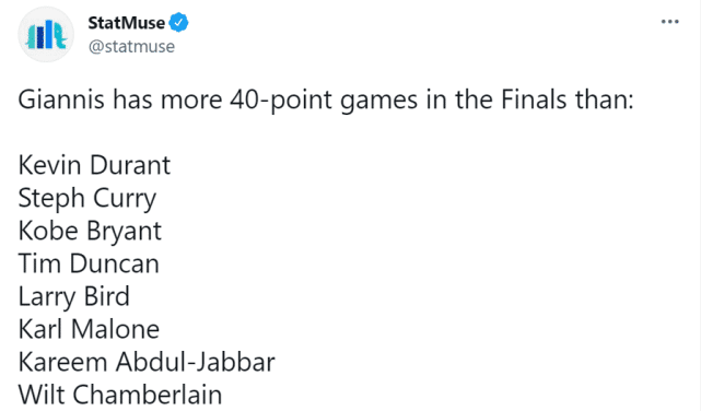 来源:优直播07-13 11:16优直播讯 北京时间7月13日,在总决赛第三场20分大胜太阳后,目前雄鹿大比分1比2落后太阳。字母哥过去两场表现不可思议,连续两场送出40+10。在总决赛两次砍下40分,字母哥目前并列历史第7,仅次于杰里韦斯特、詹姆斯、乔丹、奥尼尔、贝勒、里克巴里。而杜兰特、库里、科比、邓肯、拉里伯德、卡尔马龙、贾巴尔、张伯伦这些历史级巨星,在总决赛都是仅仅只拿过1次40分。