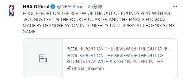 赛后NBA裁判报告显示:根据NBA规则,发界外球时,一名进攻方球员可以在篮筐上接球,在这种情况下,艾顿控制了篮球并完成了进攻,我们回放只是为了看进球是否在0.9秒内完成,结果显示只用了0.2秒,因此进球有效
