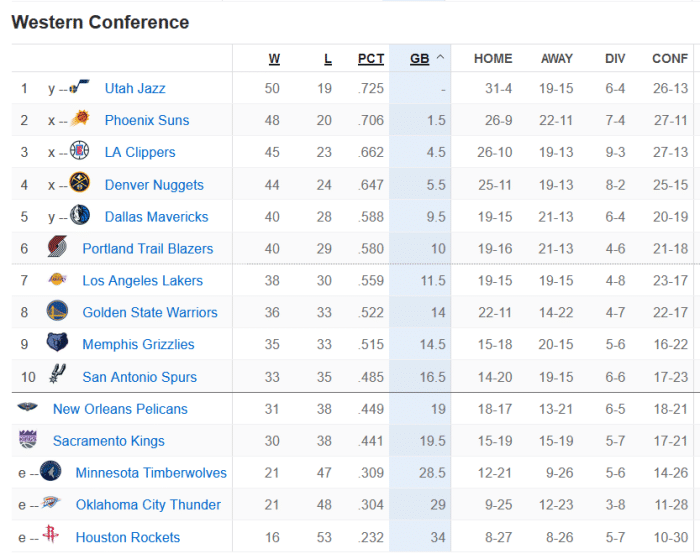 来源:优直播05-11 15:53优直播讯 北京时间5月11日,NBA常规赛结束多场争夺,西部季后赛争夺战有了新的局面。勇士爆冷击败爵士,守住第8的位置,灰熊和马刺赢球,鹈鹕争夺附加赛资格希望渺茫。开拓者击败火箭,取得4连胜,他们再次拉开和湖人的差距,不过未来他们面临3场硬仗,湖人依然有机会追赶。