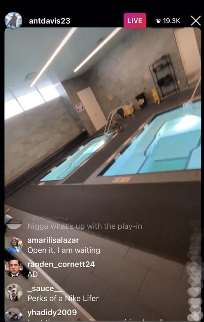 戴维斯拍摄到坐在冷水池内进行恢复性理疗的詹姆斯,并表示:“你们想看看一些更衣室独家爆料吗?他有一些三年后才会发售的球鞋。”而老詹则搞笑地评论“远离我的更衣柜,远离我的更衣柜,兄弟。哥们,闭嘴吧!”
