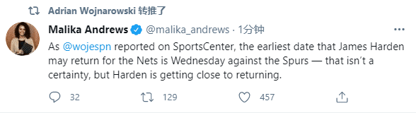 纳什透露哈登已经参加高强度训练以及分组对抗,直言哈登将会在最后四场比赛中的某一场复出,可能复出打一场甚至多场;名记沃纳罗斯基在节目中透露,哈登回归篮网的最早日期是周四复出对阵马刺,这还能不确定,但哈登已经接近回归了。
