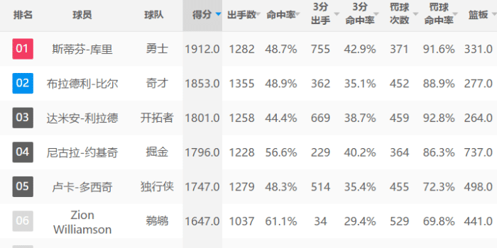 来源:优直播05-11 09:48优直播讯 NBA常规赛行将结束,单项数据王只剩下得分王还有悬念,抢断王属于巴特勒、盖帽王特纳、篮板王卡佩拉,得分王竞争者是比尔和库里,不过目前的情况出现了微妙的变化,比尔受伤了,而库里保持健康,同时他们所在的球队都只剩下4场比赛。比尔目前出战59场,总分1853分,场均得到31.4067分;库里目前出战60场,总分1912分,场均31.8666分。