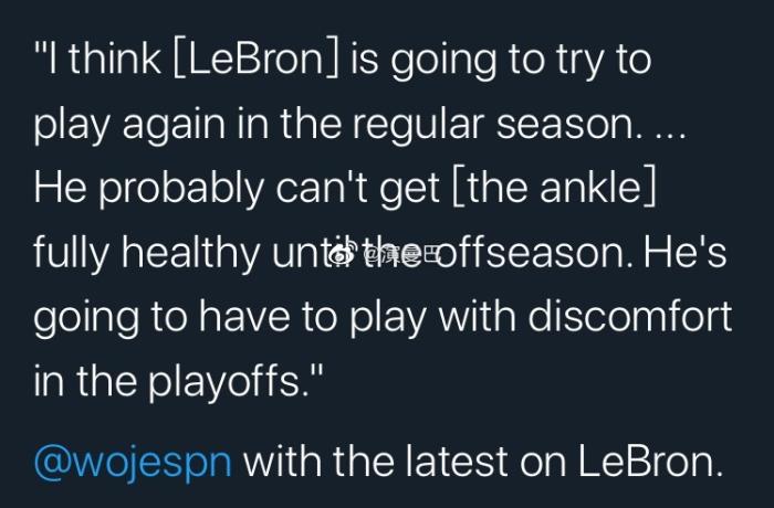 沃格尔则表示老詹在训练中状态不错,但需要回来比赛找节奏!看得出来他们对老詹完全健康回归有信心,但是名记Woj却在一档播客节目中看衰“湖人现在所担忧的——詹姆斯的右脚踝让他在缺席六周后,再次让他缺阵。而这(脚伤)将不会有很太大的改善,他将不得不在季后赛带着脚踝不适出战,直到今年夏天之前都将不会(有大的改善)。他们不得不过度消耗安东尼戴维斯”