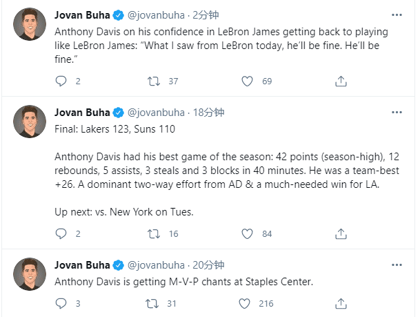 浓眉状态神勇,詹姆斯全程观战,在场边走来走去,这说明他的脚踝伤势已经无大碍;湖人双巨有可能下一场就合体,不过湖人重回西部前六的难度很大,目前湖人和开拓者都还剩下4场比赛,湖人不占优势,即使剩下四场全赢,还要看开拓者的脸色。
