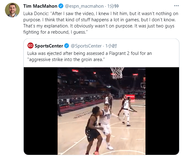 赛后东契奇回应恶犯被驱逐事件,东契奇表示:看到视频后,我知道我打了他,但我不是故意的。我认为这种事情在比赛中经常发生,但我不知道,这就是我的解释;很显然我不是故意的,我想只是两个人在抢篮板。