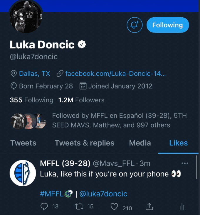 独行侠球迷账号发推写道:卢卡,如果你在玩手机的话,请点赞这条动态;随后东契奇手动点赞。
