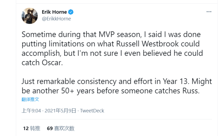 记者Erik Horne:在韦少获得MVP的那个赛季,我说过我不会对韦少能取得怎样的成就设限,但那时我不确定他能否追上大O的三双。在生涯第13年,韦少表现出了非凡的毅力和努力,可能会再过50年才会有球员追上韦少的三双纪录!