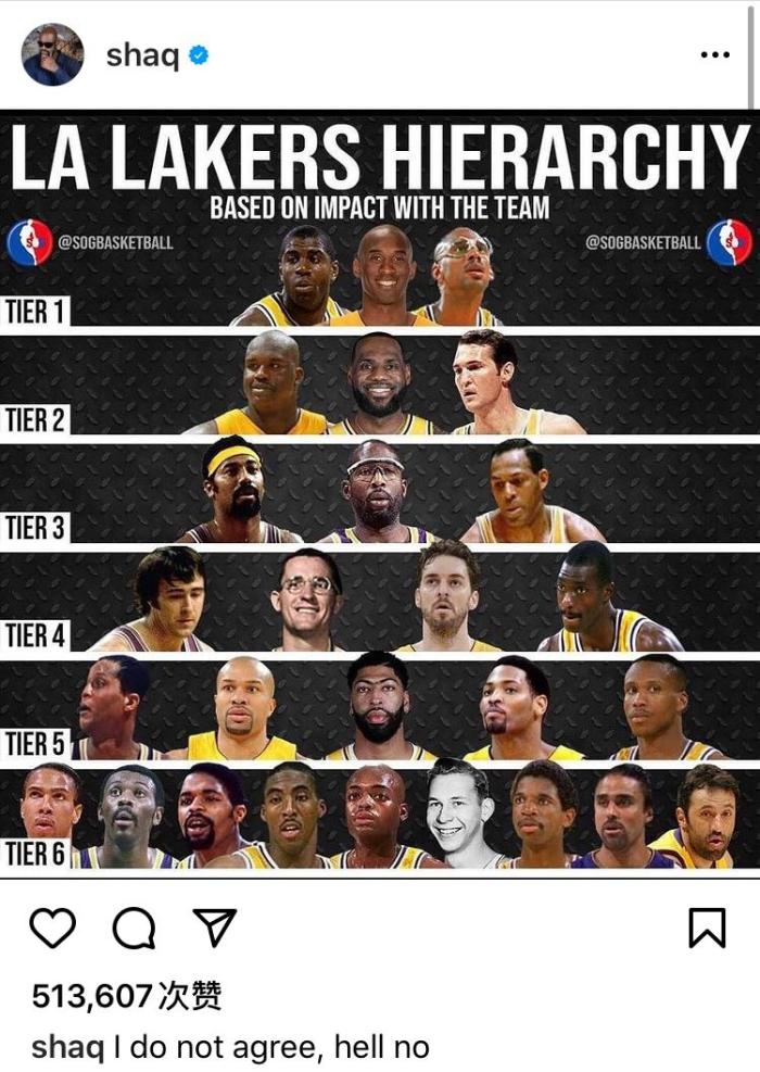来源:优直播05-09 15:07优直播讯 北京时间5月9日,前湖人名宿奥尼尔在社媒上晒出了一张由媒体制作的湖人队史球员分档图,分档基于他们的荣誉、带队能力、影响力等多个因素,奥尼尔附文“我不同意,绝不。”