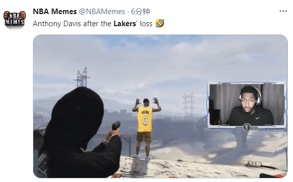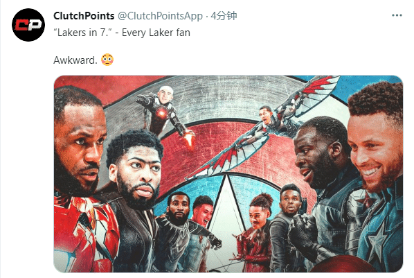 美媒Clutch Points晒出詹姆斯、浓眉等人对决库里等人的恶搞照,发推写道:湖人西部第七,所有的湖人球迷尴尬了。
