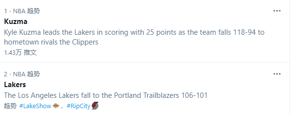 湖人惜败开拓者冲上热搜,与此同时库兹马冲上热搜榜首,全场11投2中、三分6中0成湖人惜败的一大罪人,简直被骂惨了,美媒恶搞浓眉该射杀库兹马;赛后接受采访时,浓眉低头沮丧,湖人记者Ryan Ward发推写道:这就是湖人球迷的心情。