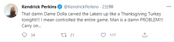 浓眉苦战39分钟轰下36分12篮板5助攻,打出复出后的最佳一战,开拓者当家球星利拉德也打出统治级的表现,全场38分7助攻4篮板,名嘴帕金斯发推写道:利拉德分割湖人就像感恩节切割火鸡似的,我的意思是利拉德掌控全场。