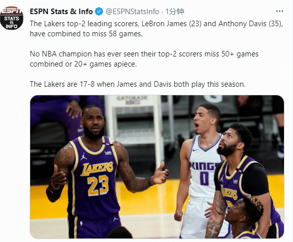根据ESPN的统计,詹姆斯和安东尼-戴维斯是目前球队的前两位得分手,詹姆斯缺席了23场比赛,安东尼-戴维斯则是缺席了35场比赛,两人合计缺席了58场比赛。