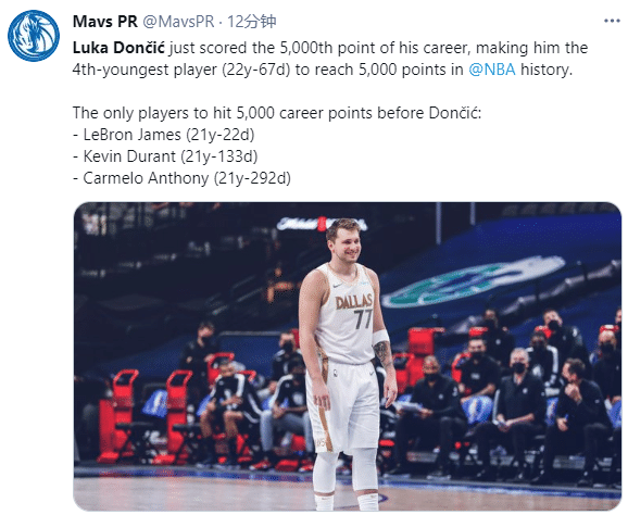 22岁东契奇里程碑之夜,独行侠官方第一时间祝贺东契奇,晒东契奇三大纪录,并且发推写道:现役最快5000分先生,他的生涯才刚刚开始而已。