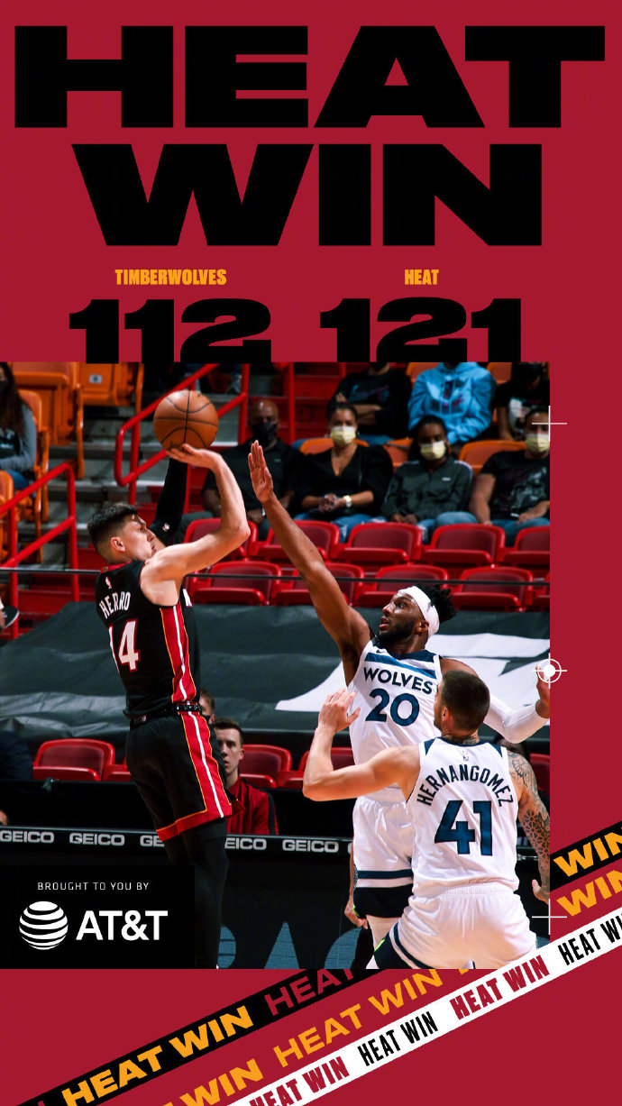 来源:优直播05-08 10:52 优直播讯:北京时间5月8日,2020-21赛季NBA常规赛继续进行,迈阿密热火坐镇主场迎战明尼苏达森林狼。全场打完,热火121-112击败森林狼,避免连败的同时,也暂时守住了东部第6的排位。