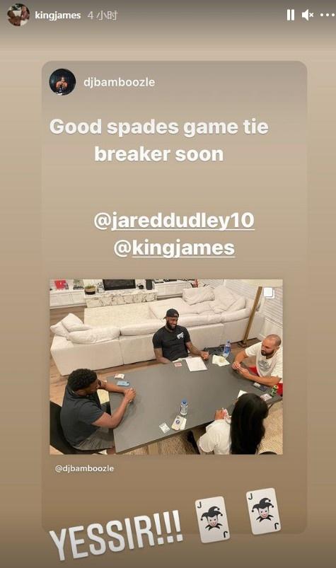 湖人领袖詹姆斯则比较放松,他并没有批评球队近期的表现,而是更新了与杜德利一起打牌的动态。可以看出,老詹面露笑容,而即将回归球场的杜德利认真打牌,似乎并不担心湖人的现状。