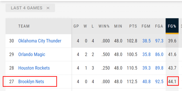 其二,两大球星的助攻数减少,个人单打比重增加,4连败期间,杜兰特和欧文的场均助攻数都下降了。这也怪不得他们,两人都是超级得分手,球队打得不顺,自然会想要通过自己的进攻接管比赛。这时候,就更体现了哈登的重要性。大胡子是篮网的发动机,能够串联球队。4连败之前,篮网场均助攻27次,排在联盟第3位,4连败期间,他们的场均助攻跌至19.3次,排名联盟第29位,只优于魔术。