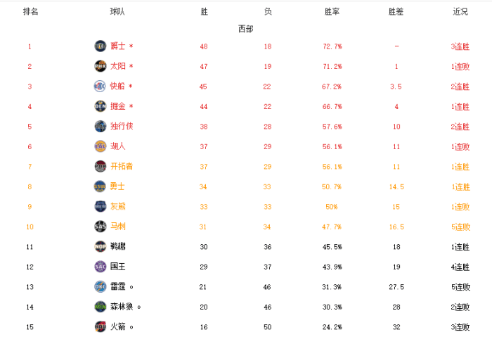 西部1-8名:爵士、太阳、快船、掘金、独行侠、湖人、开拓者、勇士;