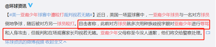 据悉,黑人球员除了殴打亚裔球员之外,还用歧视的言论辱骂亚裔球员,进行人身攻击。更让人心寒的是,在场的所有人都在看戏,亚裔球员孤军奋战,他的队友也没有前去帮助他。而且,现场的裁判熟视无睹作为比赛的掌控者,在场看戏,没有干预,一旁的家长们也置身之外,而亚裔少年根本没有得到重视。