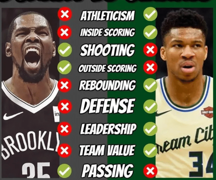 我们都知道杜兰特足够的优秀。但对于对于两届MVP的得主字母哥,请大家也给予足够的尊重。杜兰特因为出色的手感,和娴熟的变相,常常在关键时刻给对手以致命一击,所以他被人们冠以“死神”的称号。字母哥虽然常规赛大杀四方,但因为中投不稳定,会经常性地在季后赛拉胯。所以也被很多球迷定义为“伪巨星”。难道字母哥就真的那么不及杜兰特吗?