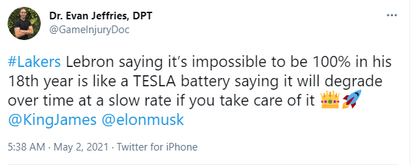 对国王一战赛后,詹姆斯就曾表示自己没有恢复到100%,也不大可能在余下生涯中恢复到100%了。毕竟他是一位36岁的老将了。医学专家Evan Jeffries也谈到了詹姆斯的这一言论。“勒布朗说他在第18个赛季里已经不可能达到100%的状态了,就像是一块电池,如果你注意保养,它的老化速度会减缓一些。”