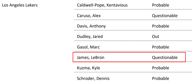此前对国王一战,詹姆斯时隔41天终于复出,贡献16分8篮板7助攻,遗憾的是他未能命中三分绝杀,球队最终惜败于国王。过去6场比赛,湖人输掉5场,要想保住西部第5的位置,他们必须尽快赢球。不过,湖人也得兼顾球员的伤病情况,詹姆斯刚刚复出,医疗组需要密切关注他的脚踝反应,看看他是否有疼痛或者僵硬的感觉。把詹姆斯列为出战成疑,也说明了他的状况并未恢复到100%。