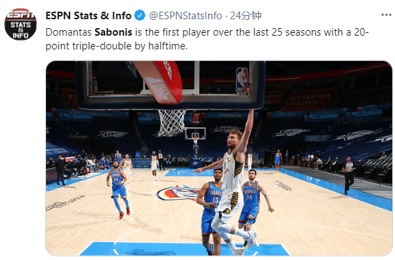 比赛一开始,步行者就早早把雷霆按在地板上摩擦,首节42-29净胜雷霆13分,这只是步行者造惨案的开端而已,第二节40-17又狂赢23分,半场82-46足足领先36分,小萨博尼斯上半场轰下20+三双;到了下半场,步行者进攻火力丝毫不减,第三节44-24又赢20分,比赛早早沦为垃圾时间,最终步行者57分屠杀雷霆,最大一度领先到67分。