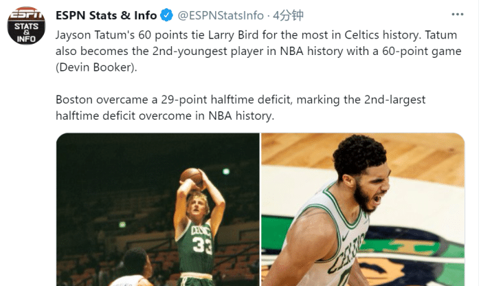 60分不仅创造了个人生涯新高,也追平了拉里伯德保持的队史单场得分纪录!最重要的是,凯尔特人最多的时候落后32分啊!32分也创造了NBA本赛季最大逆转!