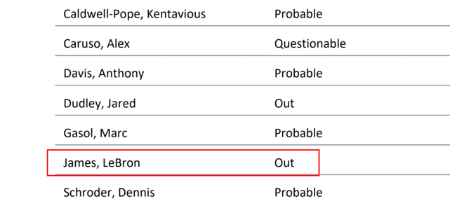 来源:优直播04-28 11:10优直播讯 北京时间4月28日,NBA官网公布了明天湖人vs奇才的最新伤病名单。湖人队一方,詹姆斯和杜德利同为Out,两人继续缺阵;浓眉、波普、小加索尔、施罗德同为Probable(75%可能出战),大概率能打;上一场出现背部痉挛的卡鲁索状态为Questionable(50%可能出战)。