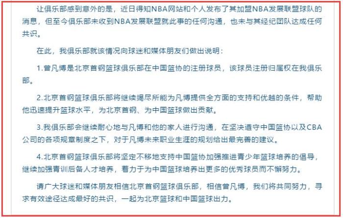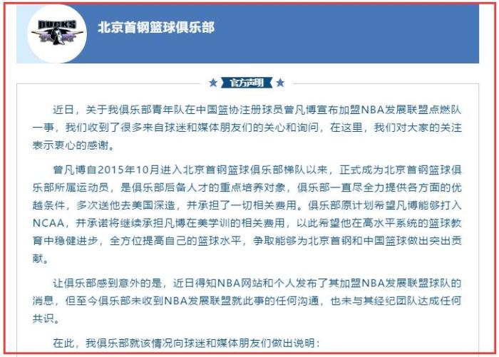 最后,首钢也表示,选择支持曾凡博的决定,是从中国篮球人才培养的大局出发,而不是因为球员损害球队利益,而加以阻止!