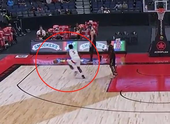 这次发球,乐福漫不经心的用手将裁判传过来的皮球击打了一下,篮球无力的飞向界内,按照边线球规则,只要界外发球的球员触碰到了篮球,并将篮球碰向界内就被默认是球已经被成功发出,计时器开始计时比赛继续,此时猛龙五号球员斯坦利-约翰逊果断出击拿下皮球,跑到底角处回传给了跟进的马拉奇-弗林,后者空位三分命中,而乐福全程看戏,无动于衷,就连准备接后场球的队友加兰都被乐福的神操作看呆了,木讷的目送篮球入网。