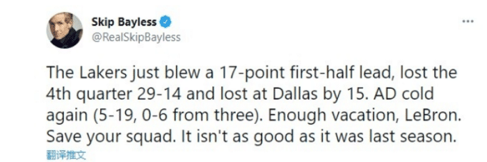 而最大詹黑Skip Bayless在社媒上谈到现在的湖人,他催促詹姆斯尽快复出去拯救湖人队。“湖人今天浪费了17分领先优势,第四节被独行侠打了29比14,最终输掉了比赛。戴维斯又一次状态低迷(19投5中,三分6中0)。勒布朗,该结束休假了,回来拯救你的球队。本赛季的情况比上赛季糟糕”。