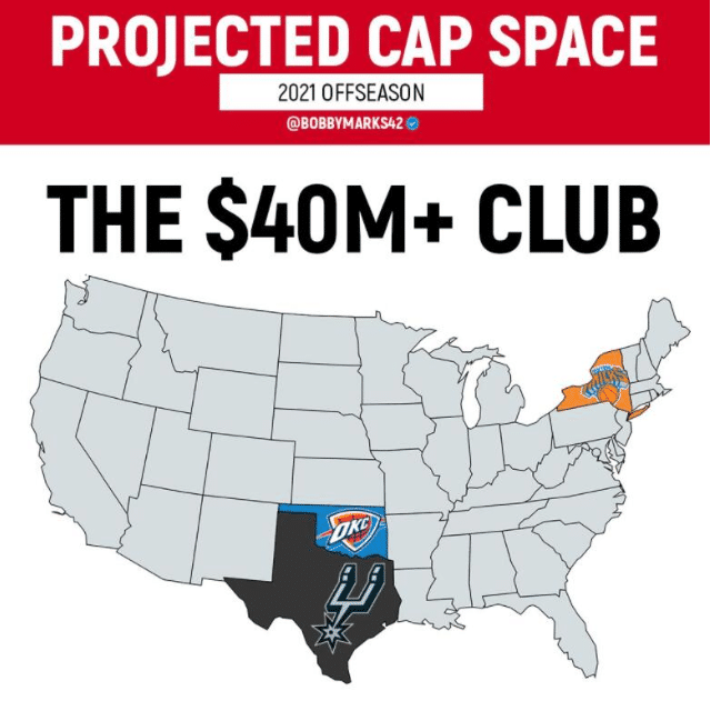 尼克斯最逆天的,不是本赛季,而是充满希望的未来。据美媒体报道,到了2021年休赛期,尼克斯坐拥超过4000万美元的薪资空间。另外还有雷霆和马刺,也是拥有超过4000万空间。