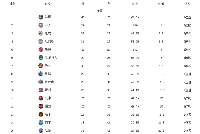 来源:优直播04-25 16:09优直播讯 NBA常规赛进行到现在,大部分球队都只剩下9-12场比赛了,这其中东部的格局已经越来越清晰了,篮网、费城和雄鹿争夺常规赛东部冠军,尼克斯和老鹰作为黑马搅局直通季后赛的前六名,而附加赛资格的席位也很明朗,猛龙和公牛掉队了,奇才强势逆袭。