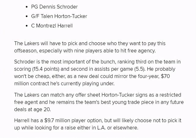 美国媒体《bleacherreport》专栏记者GREG SWARTZ撰文分析,湖人队在今年夏天肯定会续约的3个自由球员,其中包括施罗德、哈雷尔和小塔克。虽然其他球员也都对于球队非常重要,但是湖人队的薪资空间有限,包括德拉蒙德、卡鲁索等球员都想要拿到更大的合同,湖人队很难留下他们。