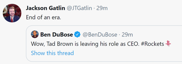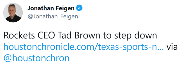 火箭老板费尔蒂塔随后发表一份声明:“我代表整支火箭队和我的家人,感谢泰德(布朗)对休斯顿火箭队的出色贡献和不懈努力。自从成为球队老板以来,我真的找不到一个比他更出色的领导者来一起工作了。”